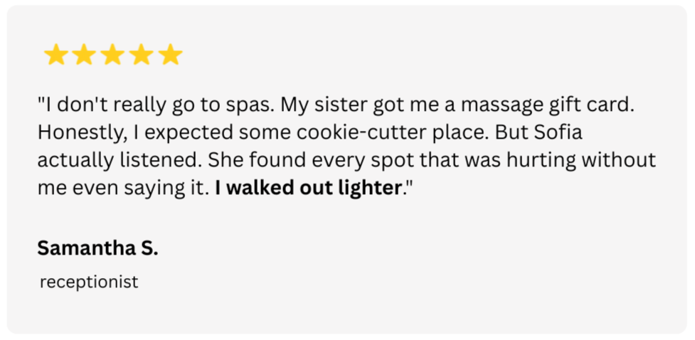 Choose your preferred massage and a time that works for your schedule. Enter your information, & secure your session directly online